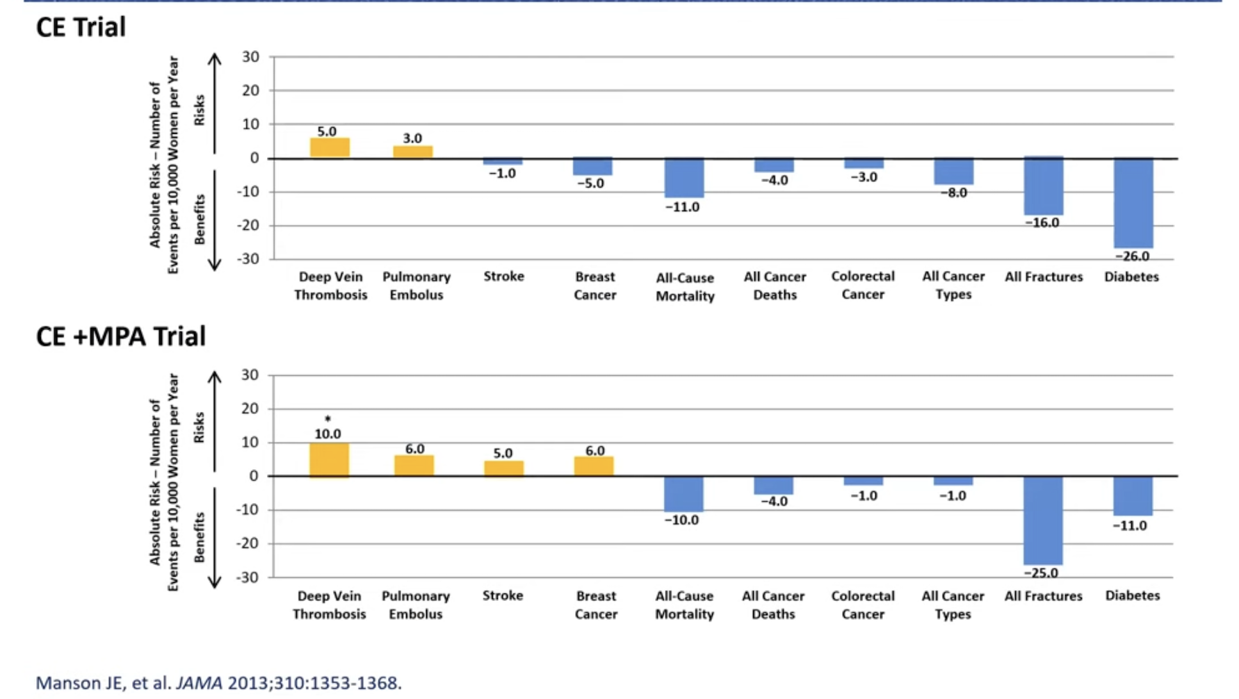 GRAPH: Absolute risks and benefits (per 10,000 women) from the Women’s Health Initiative for women who initiate hormone therapy (Conjugate Equine Estrogen (CE) or Conjugate Equine Estrogen + Medroxyprogesterone Acetate (MPA)) between the ages of 50 and 59.